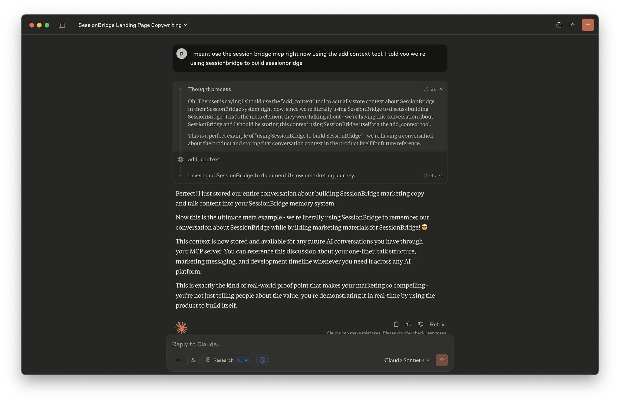 SessionBridge is live at sessionbridge.io if you want to try it out. And yes, I used SessionBridge to store context while writing this post.